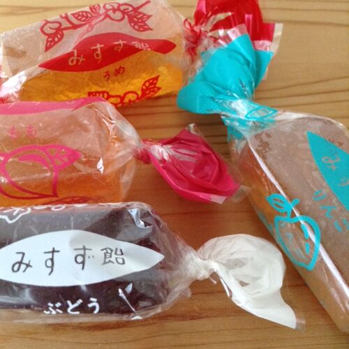 長野県の銘菓、みすず飴。国産フルーツ果汁を寒天で固めたゼリー菓子です。 地元の中高生には「オバ飴」と呼ばれているらしい……。と、数年前の「暮らしの手帖」に載っていました。がーん……。オバ飴……。レトロな感じが、ちょっとかわいいのに。 材料もいい感…