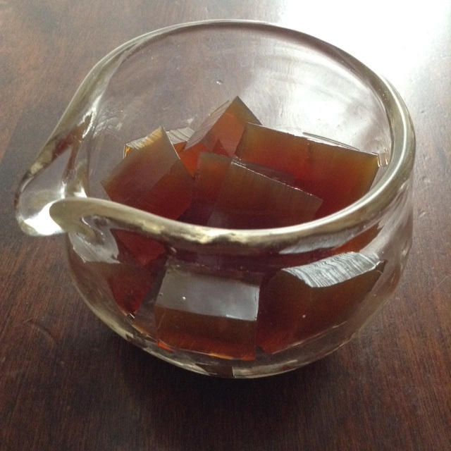 2017-06-09 角切りしゃっきり☆コーヒーゼリー ゼリー 寒天 昨日のカフェオレゼリーはゼラチンでしたが、今日のコーヒーゼリーは寒天。食感が違います。ゼラチンはまったり。寒天はしゃっきり。 もぐもぐ。 明日は気温30度を超す予報が出ていますが……ホントに……?